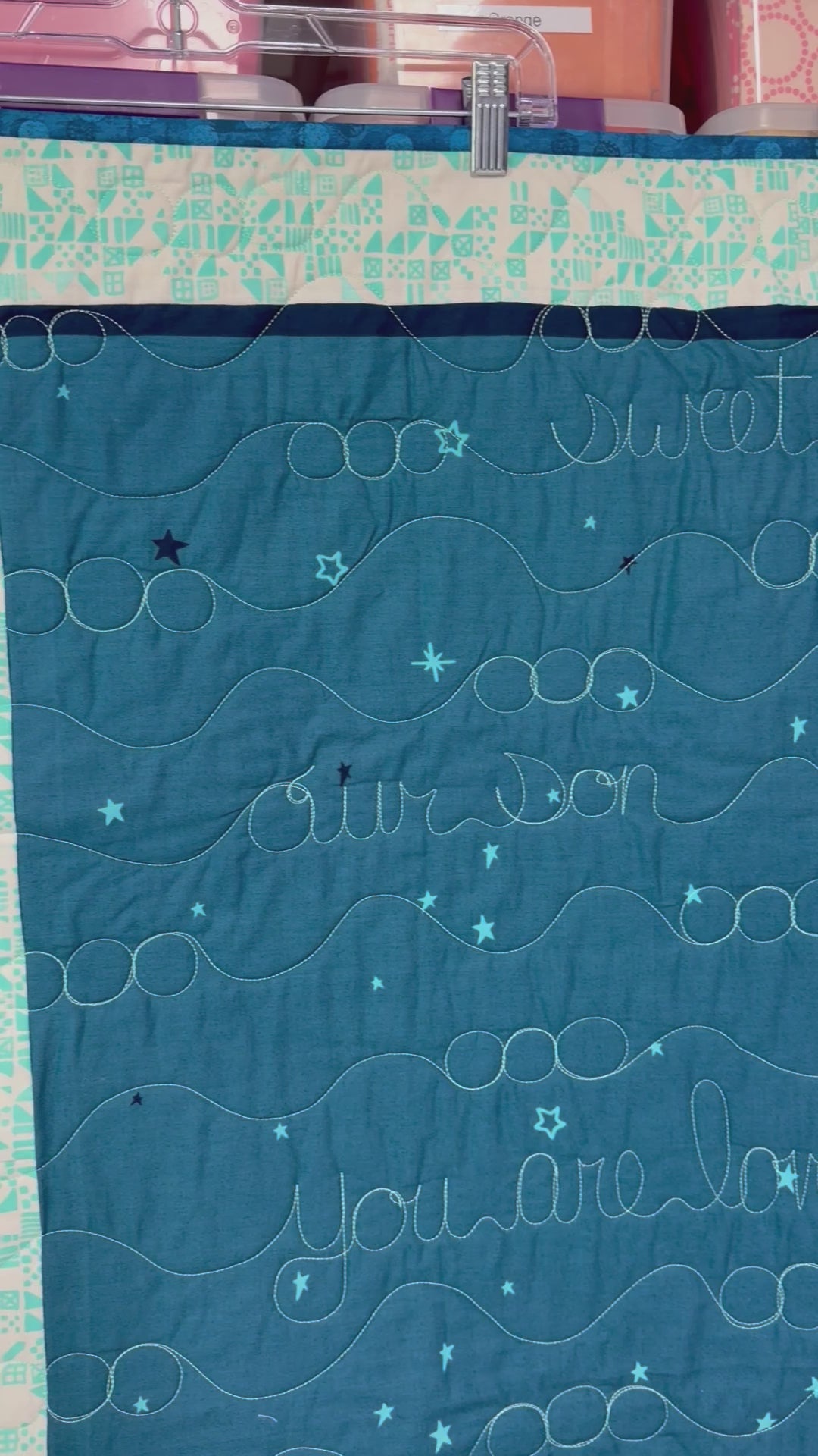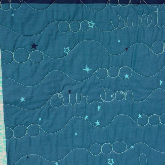 This Baby Growth Quilt is thoughtfully designed for capturing monthly milestone photos of your newborn, allowing you to easily track their growth throughout the first year. The side of the quilt features numbered markers to highlight each month, making them both functional and memorable. The custom quilting incorporates charming baby phrases such as “Sweet Baby Boy, Our Son, You Are Loved, Handsome Boy, Little Man, and Cutie Pie,” adding a heartfelt touch. Crafted in a soothing palette of warm teal, navy and aqua, this quilt features a coordinating multi-colored dot print on an off-white background for the backing, ensuring a polished and cohesive appearance. This quilt measures approximately 40” wide, by 48” long.