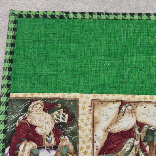 This elegant set of Christmas Quilted Placemats includes six individually crafted placemats, each measuring approximately 14” x 21”. Every placemat is expertly free-motion quilted with a distinct holiday phrase, such as “Merry Christmas,” “Winter Wonderland,” “Jingle Bells,” “White Christmas,” “Let it Snow,” and “O Christmas Tree.” The reverse side features a stylish green and black plaid fabric, perfectly coordinated with the binding for a cohesive look. The Santa-themed fabrics showcase a timeless representation of St. Nick in a sophisticated palette of burgundy, green, cream, lavender, and gold, adding a refined touch to your seasonal décor.