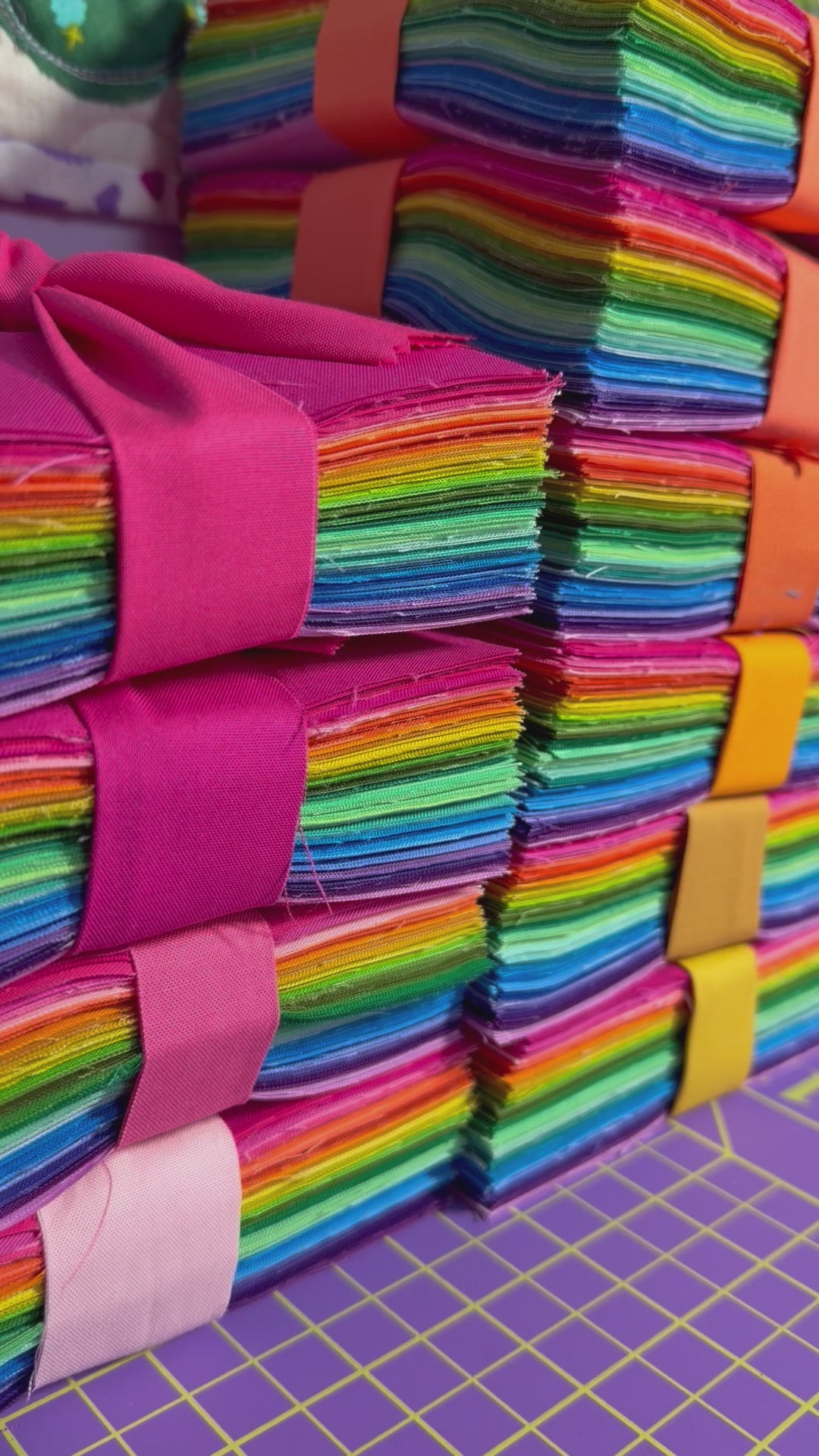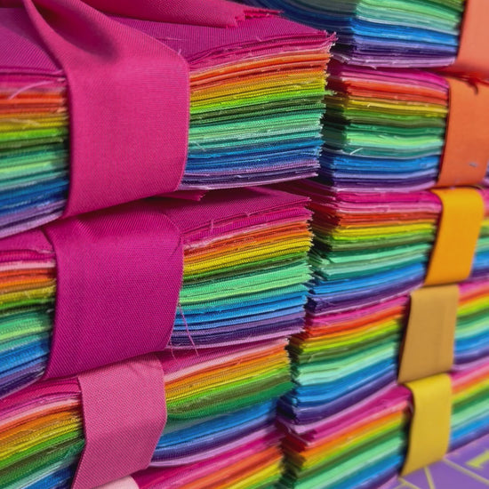 JQ Packs (JessicaQuilter Packs of Fabric) are thoughtfully curated bundles, each assembled with precision and care. Every bundle is individually hand-cut by me, ensuring attention to detail in the selection of fabrics. Each pack features 54 distinct Kona Solid fabrics, totaling over 100 squares per bundle. This exclusive assortment is not available elsewhere. Please note, as each bundle is crafted by hand, slight variations may occur between sets. While every effort is made to ensure quality and accuracy, minor imperfections are possible due to the hand-cutting process.
