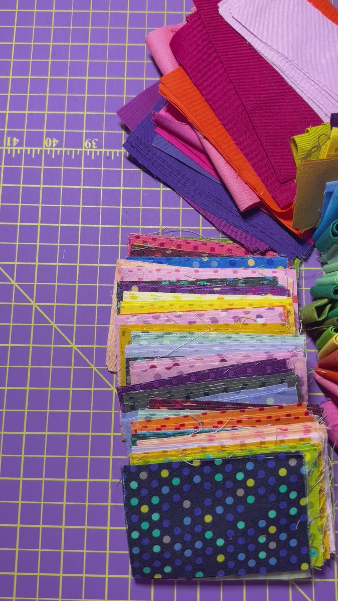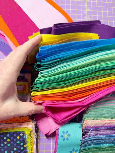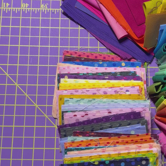 Scrap Bag – Rainbow - Kona Solid strips, Dazzle Dots in 2.5” sizes, a lot of rainbow strips 1/5” x 5”. Weighs 1lb 12oz