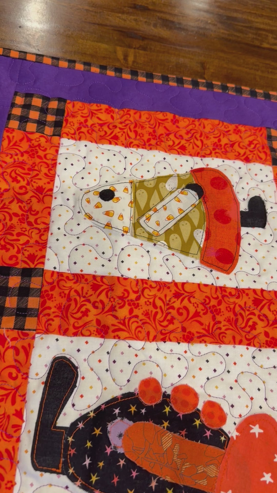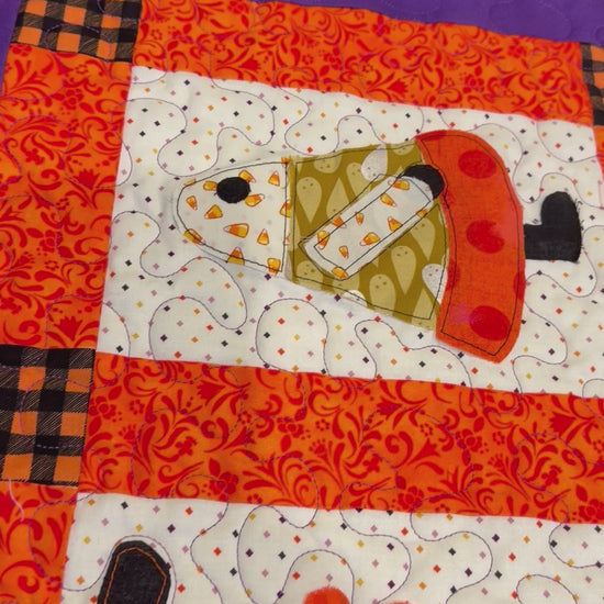 The Trick or Treat Ghosts Table Runner offers a charming and distinctive touch to Halloween décor. Expertly crafted, this table runner measures approximately 17 inches by 51 inches. The highlighted ghost motifs are inspired by the classic “Sun Bonnet Sue” design and are elegantly depicted as charming Trick or Treaters. Each ghost is created using raw-edge appliqué and are oriented in opposite directions, ensuring the design is visible from both sides of the table. The runner is backed with coordinating bat-themed fabric, while the binding complements the front design for a cohesive look. This table runner is an ideal gift for anyone who appreciates festive Halloween decorations.